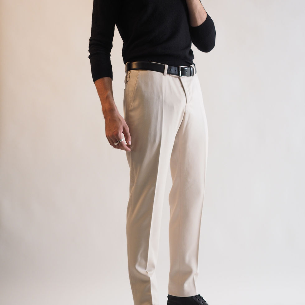 Elevate your wardrobe with a masterpiece designed to be worn. These trousers are not just a garment, but an artful fusion of function and luxury. Beyond the four classic pockets, a hidden fifth pocket is discreetly integrated into the right seam, ingeniously concealed with a sleek zipper. This thoughtfully placed compartment offers a secure and subtle space for your most valuable possessions, safeguarding them from loss or theft.